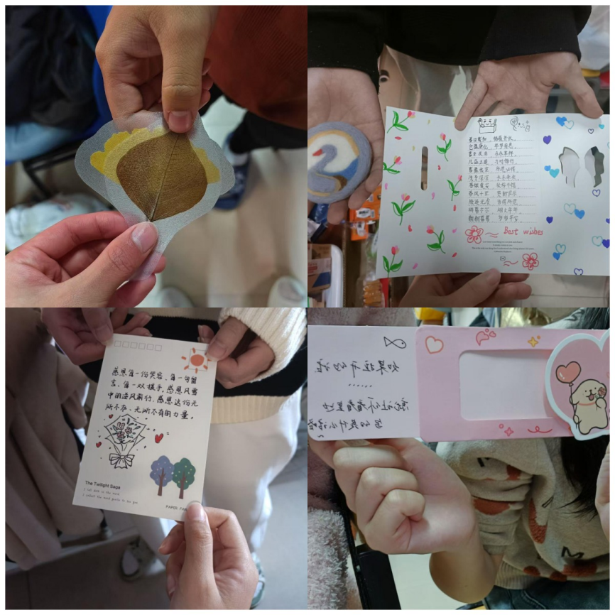活动以制作感恩卡片和手工礼物为主要形式,鼓励员工们发挥创意,亲手制作饱含深情的作品,向身边的同学、老师以及校园工作人员表达感激之情。活动前期,实践部线上线下宣传同步推进,详细介绍活动时间、报名条件和参与方式。活动反响热烈,主办方提前建立活动QQ群,并于11月21日发布报名表,同学们积极响应,纷纷参与。活动开始后,参与者根据个人创意自行购买DIY材料,全身心投入手工制作。制作完成后,由主办方统一审核。12月3日,主办方对所有手工制作成果进行汇总展示。