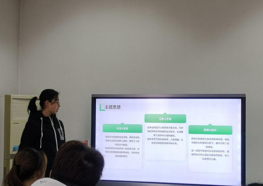 《局外人》讲述了主人公在面对生活中的种种荒诞时所表现出的冷漠与真实。顾博同学结合当下生活现状,分享了如何保持真实的自我,用一种更加真实的态度去面对生活。连思睿同学分享的《追风筝的人》展现了人性的复杂、友情的珍贵与自我救赎的艰难,带领大家感受到文学的力量照亮了心灵的角落。