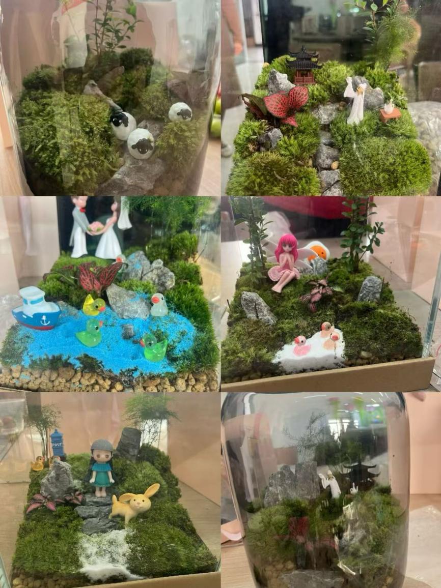 活动开始,专业微景观园艺师向大家介绍了微景观生态瓶制作的方法和注意事项。女教师们从挑选玻璃容器、铺设营养土,到搭配植物、点缀砂石与装饰,纷纷化身“微观世界设计师”,在方寸之间搭建起绿意盎然的迷你花园。活动现场,教师们一边交流教学心得,一边分享生活巧思。有的教师将实验器皿的摆放技巧融入景观布局,有的教师则从力学角度来搭配植物层次。活动尾声,一盆盆风格各异的微景观作品摆满展台,有的清新雅致如江南园林,有的童趣盎然似欢乐城堡,有的五彩缤纷像童话森林。