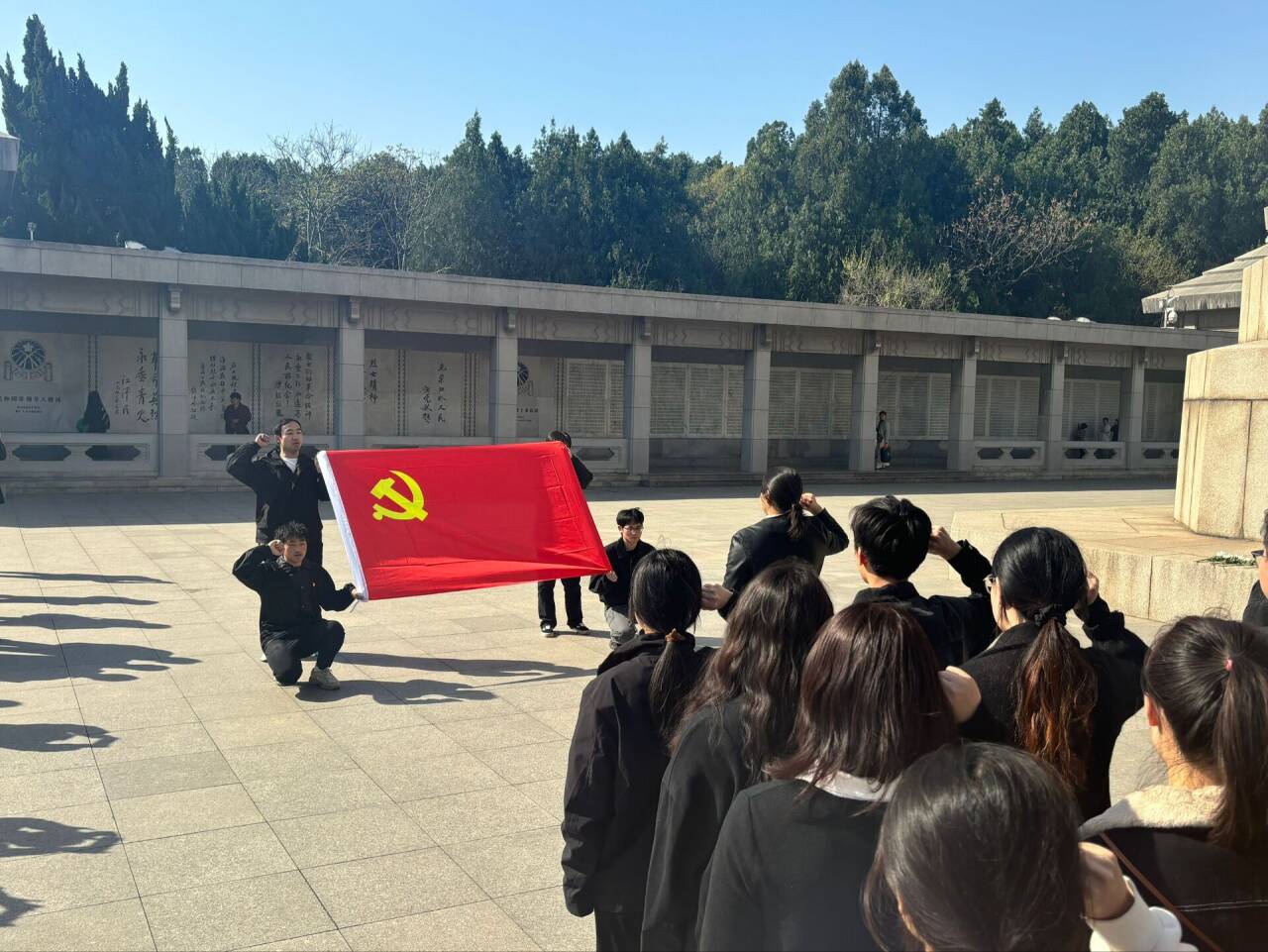 最后,封中原同学领诵入党誓词,全体党员同学面向鲜红党旗,整齐列队,右手握拳高举,铮铮誓言回荡在纪念塔前,激励着每一位党员砥砺初心使命,传承革命精神。宣誓结束后,全体成员绕塔一周,立于铭刻英烈姓名的石碑前,众人垂首缓步,目光沉凝,以无声的追思与深躬之礼,向为国捐躯的忠魂致以至诚敬仰。