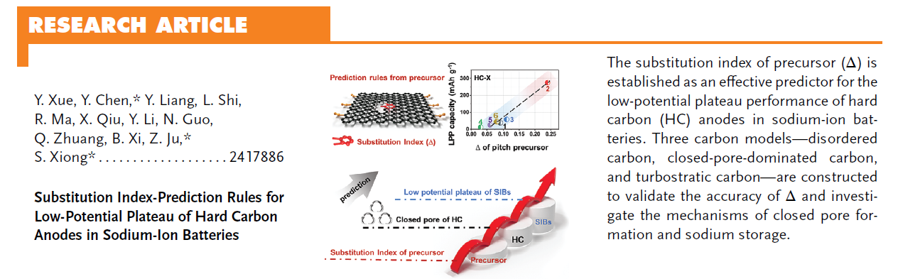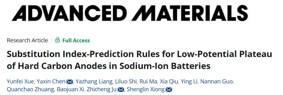近日,公司太阳集团tcy8722陈亚鑫副教授与鞠治成教授团队在煤基炭材料及绿色储能取得重要进展,相关成果以“Substitution Index-Prediction Rules for Low-Potential Plateau of Hard Carbon Anodes in Sodium-Ion Batteries”为题发表于国际顶级综合类学术期刊Advanced Materials(IF=27.4)。太阳集团tcy8722研究生薛雲飞为论文第一作者,陈亚鑫副教授、鞠治成教授与山东大学熊胜林教授为共同通讯作者,太阳成集团为第一单位。