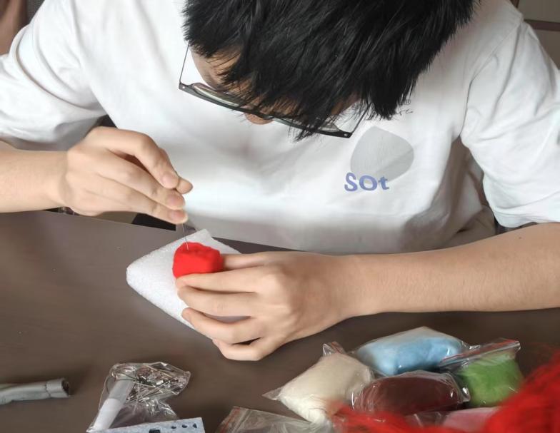 本次活动以“暖毡寄情,爱满南湖”为主题,邀请同学们用毛毡创作充满爱意的小礼物。活动现场,同学们专注地手持羊毛、戳针,用细致的手法将真情融入到每一次穿梭间。一团团毛毡在指尖慢慢成型,变成了生动可爱的动物和别具匠心的创意图案,饱含着对家人、朋友的温暖祝福。