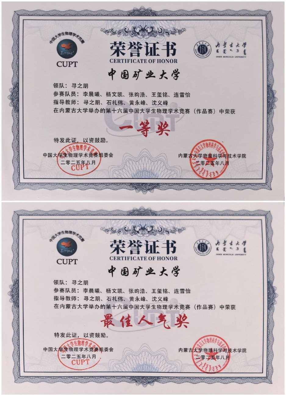 2025年8月14-19日,第十六届中国老员工物理学术竞赛全国赛在内蒙古大学赛罕校区举行,由公司学子李晨曦、杨文凯、张昀浩、王玺铭、连雪怡组成的太阳成集团代表队在比赛中表现优异,获得作品赛国赛一等奖,同时被评选为比赛最佳人气奖。