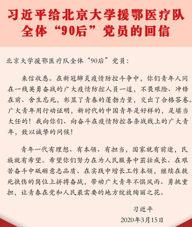 疫情期间,“90后”一代纷纷请战前线,作为新时代的青年人,他们不畏艰难、冲锋战场,令人感动。于此,各团支部组织团员共同学习青年党员的精神,并通过学习习近平主席为其回信的内容,均感受到他们所贡献的力量,并深刻领悟 “青年一代有理想、有本领、有担当,国家就有前途,民族就有希望”的真正含义。