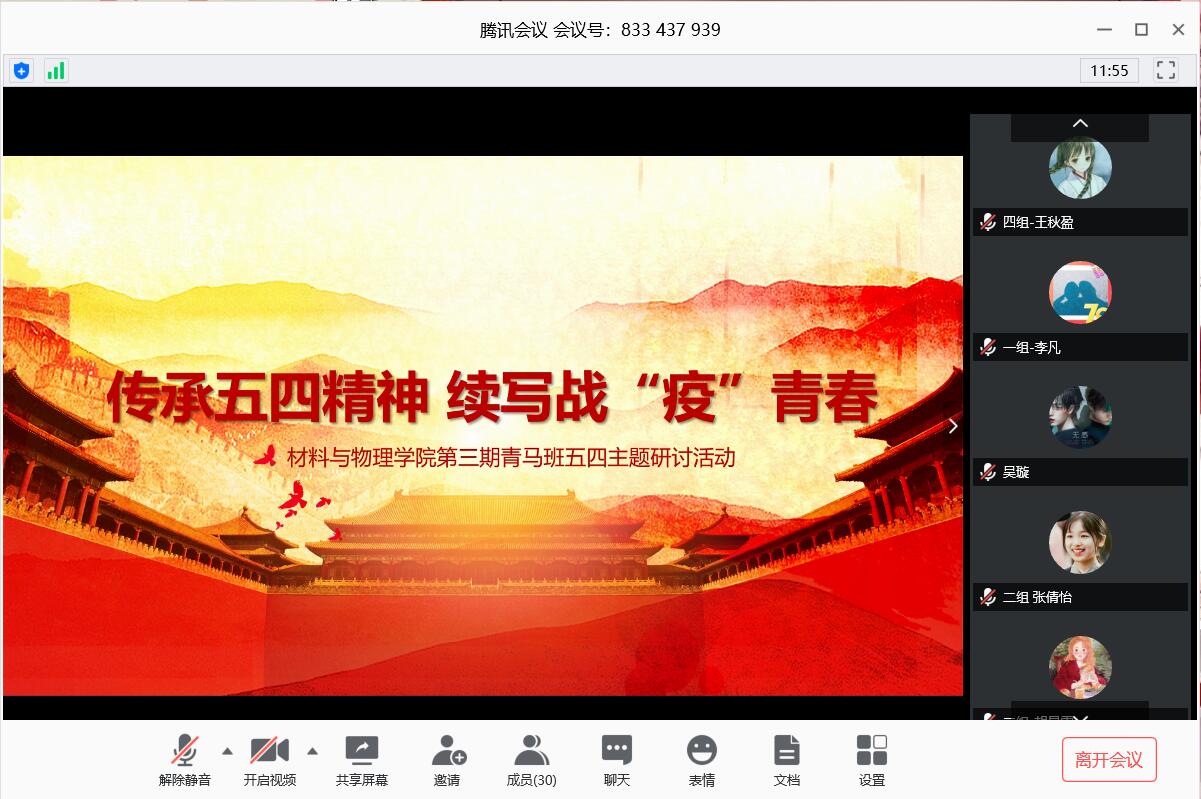 5月5日上午,太阳集团tcy8722第三期青马班在腾讯会议上召开“传承五四精神 续写战疫青春”为主题的五四研讨活动,参加成员有太阳集团tcy8722第三期青马班的全体成员,青马班团支书徐子涵同学主持此次会议。