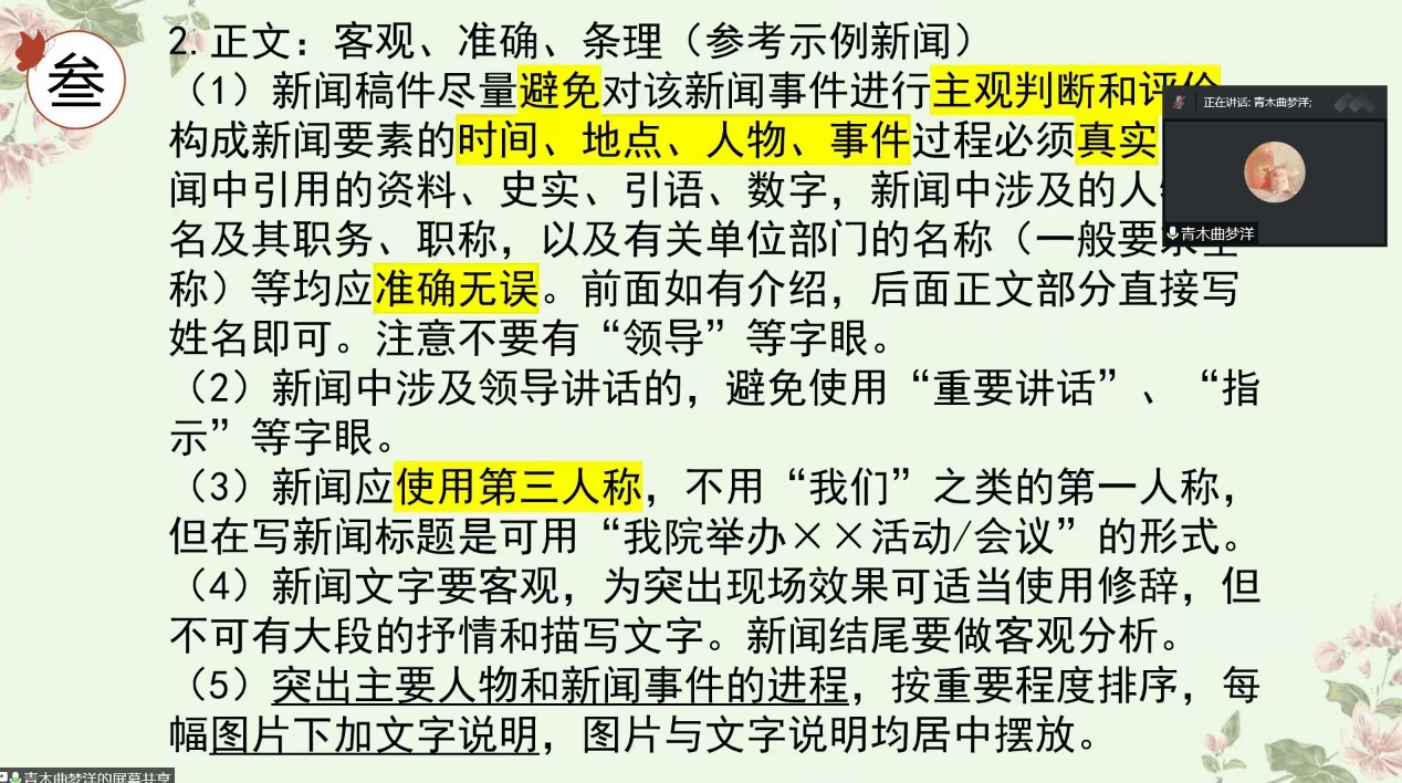 青木记者团曲梦洋同学对新闻撰写做出说明,分别指出新闻交接、预约、撰写的要求,强调新闻要求客观真实、避免主观判断。