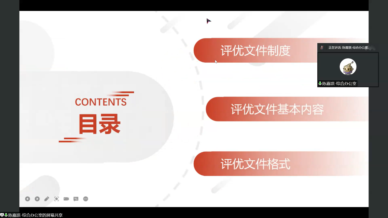 陈嘉琪同学对评优文件做出说明,从制度、内容、格式三个方向进行介绍,强调评优文件制度的目的是促进团学组织发展、提高员工服务质量,对评优文件基本内容与格式进行系统说明。