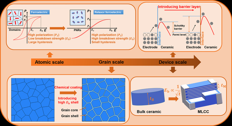 钛酸钡基无铅储能MLCC在原子尺度上,向BaTiO3(BT)中引入Bi(Zn2/3(Nb0.85Ta0.15)1/3)O3(BZNT),将具有长程有序畴结构的铁电体转变为具有极性纳米微区的弛豫铁电体,可以有效降低体系在电场中响应的滞后性;在晶粒尺度上,向BT-BZNT晶粒表面引入高绝缘和高击穿强度的SiO2包覆层,可以大幅增强体系的击穿强度;在器件尺度上,在电极与电介质的界面处引入SiO2阻挡层,可以有效降低漏电流和电场集中程度,从而使击穿强度,储能效率,温度稳定性和可靠性得到较大的改善。在多尺度优化策略的指导下,作者利用两段式无压烧结方法制备了以60Ag/40Pd为内电极的具备优异储能性能的BTBZNT@SiO2 MLCC。两段式无压烧结使得MLCC具有细小均匀的纳米晶,可以有效提高其击穿强度,储能效率,直流偏压特性和可靠性;