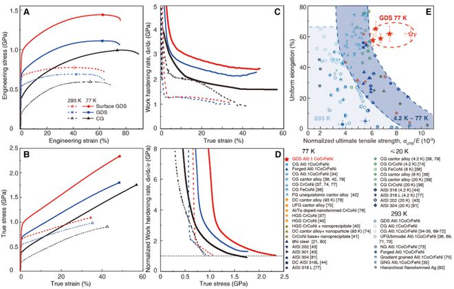 图2. GDS 合金在 77 K 时的应变硬化和强度-延展性组合