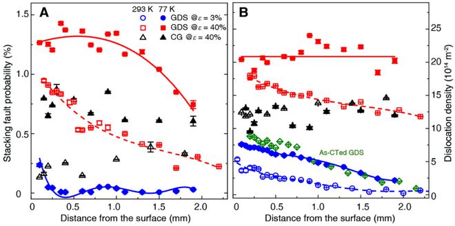 图4. GDS 和 CG 合金在 77 K 拉伸后 SF 概率和位错密度的演变