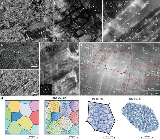 中科院金属所卢磊研究员团队的实验结果为我们揭示了一个奇妙的现象:在77开尔文条件下,一种具有梯度位错单元的稳定单相合金在整个变形阶段的应变硬化率竟然超过了粗晶粒材料。这一发现颠覆了我们的传统认知,因为这种特殊的应变硬化竟然源于一种独特的动态结构细化机制,既是由大量多方向微小堆积断层的发射和运动所促成的,与传统的线性位错介导变形有着天壤之别。更令人惊讶的是,原子尺度平面变形层错在塑性变形中的主导地位为增强和硬化金属材料引入了新的方法,为开发高强度和韧性材料提供了一种不同的范式,尤其适用于深空和海洋探测、液化天然气储存、低温物理等广泛的低温应用领域。