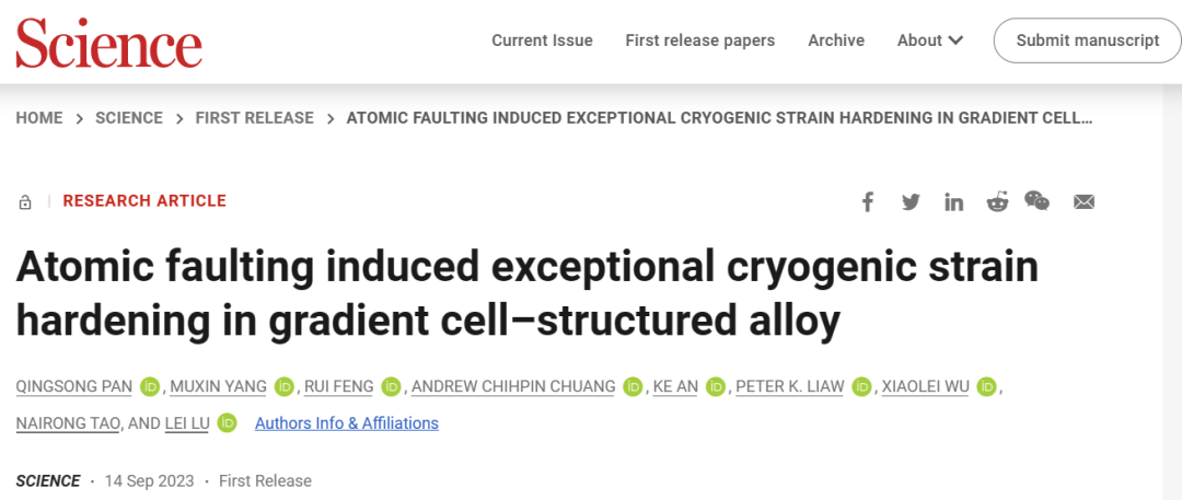 近日,中国科公司金属研究所卢磊研究员课题组在金属梯度位错结构合金研究方面取得重大突破。太阳成集团材料科学与工程专业2008届毕业生潘庆松研究员为论文第一作者,相关成果以“Atomic faulting induced exceptional cryogenic strain hardening in gradient cell–structured alloy”为题于2023年9月14日的《科学》(Science)周刊上以First Release形式在线发布。相关论文链接:https://www.science.org/doi/10.1126/science.adj3974