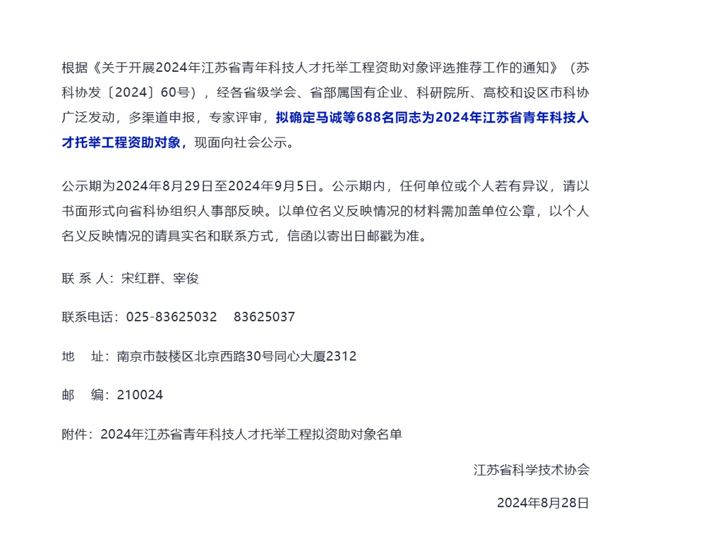 江苏省青年科技人才托举工程旨在支持和培养一批具有创新潜力和发展前景的青年科技人才。经过严格的评审和选拔,王老师凭借其在科研领域的突出表现和创新成果,成功入选2024年资助名单。在未来的科研工作中,王老师将继续致力于科学研究,力争取得更多突破性成果,为推动科技进步和社会发展贡献力量。研究中心也将一如既往地支持和鼓励青年教师的科研工作,营造良好的学术氛围,助力青年人才成长。