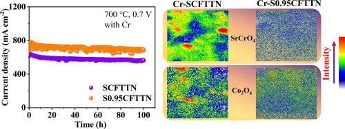 本文提出了一种提高中熵Sr1-xCo0.5Fe0.2Ti0.1Ta0.1Nb0.1O3-δ (S1-xCFTTN, x= 0-0.15)中温固体氧化物燃料电池(t-sofcs)阴极氧还原反应(ORR)活性和Cr耐受性的有效策略。在适当的Sr缺乏下,Sr0.95CFTTN具有最高的电导率和最快的氧交换动力学。优化后的阴极在700°C时的极化电阻为0.024Ωcm2,远低于SCFTTN阴极的0.037Ωcm2。在此基础上,阴极为Sr0.95CFTTN的阳极支撑电池在800℃时的峰值功率密度为1153.5mWcm-2,远高于阴极为SCFTTN的电池。此外,S0.95CFTTN阴极对Cr的耐受能力显著增强,这是由于Sr缺陷减少了表面Sr偏析,从而形成了SrCrO4。结果表明,适当的缺锶是提高SOFC阴极ORR活性和稳定性的有效途径。